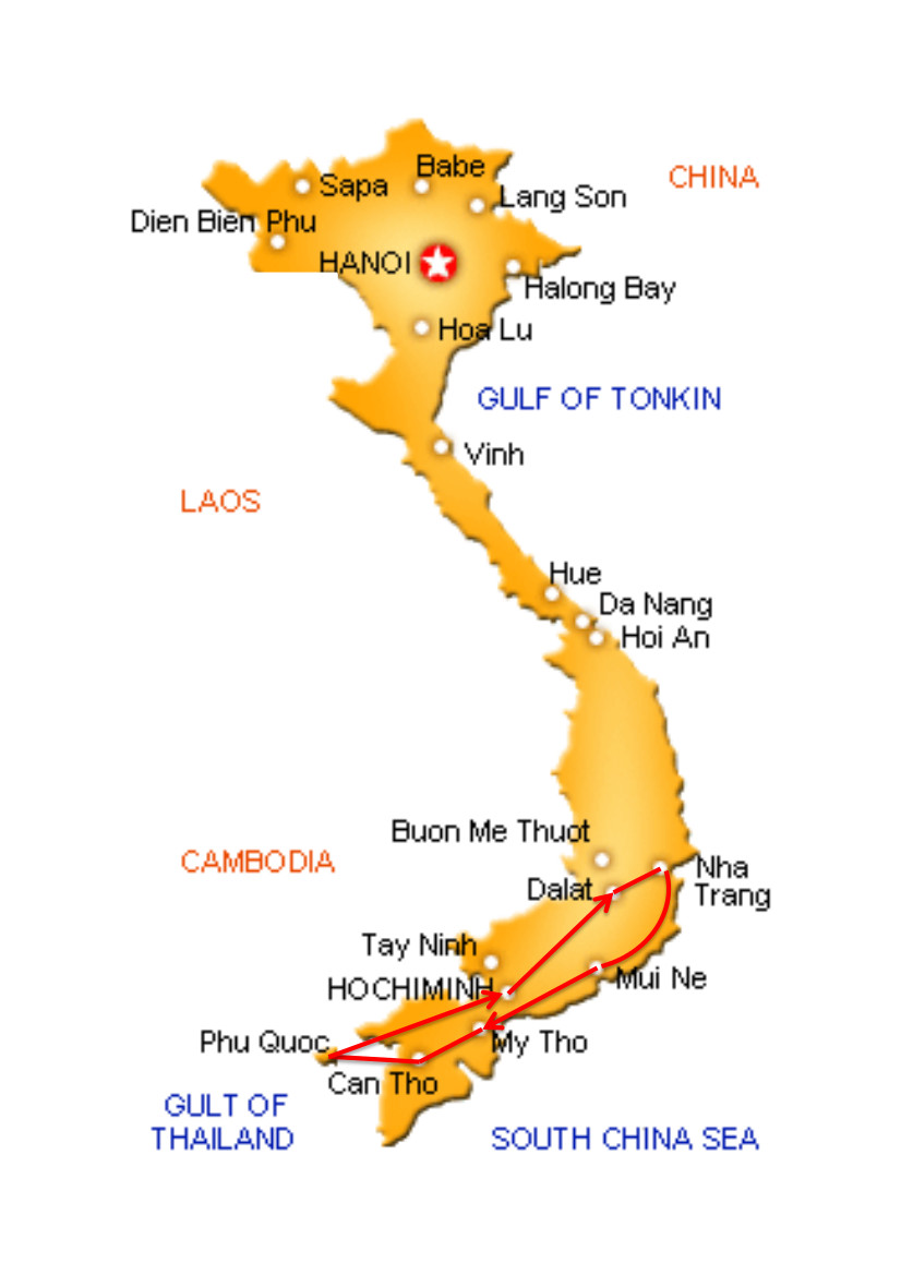 Départ de Paris le mardi 25 décembre 2012 - HO CHI MINH / 26 et 27 décembre 2012 - DALAT / 28 et 29 décembre 2012 - NHA TRANG / 30, 31 décembre et 1er janvier - MUI NE / 2 et 3 janvier 2013 - MY THO / 4 et 5 janvier 2013 - CAN THO / 6 janvier 2013 - PHU QUOC / du 7 au 9 janvier 2013 - HO CHI MINH / 10 et 11 janvier 2013 |